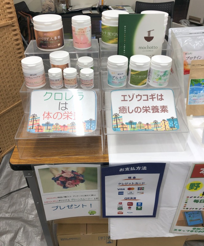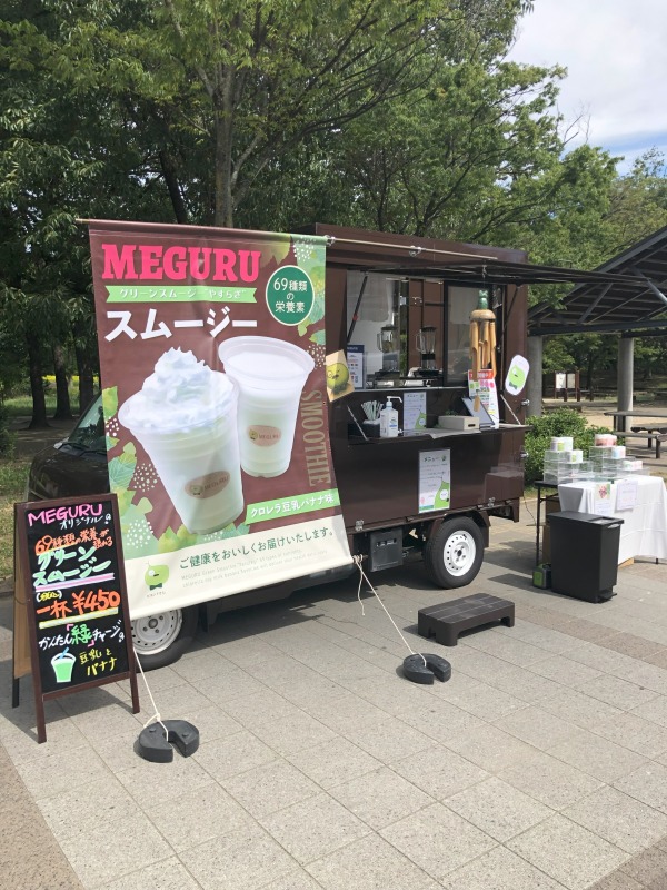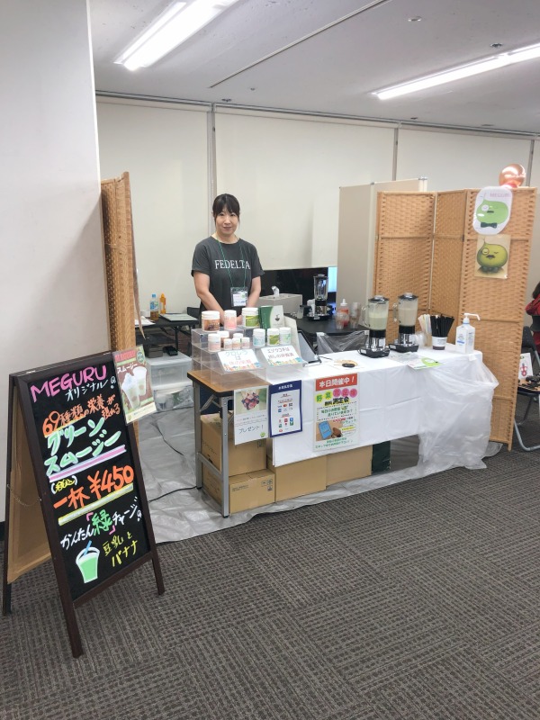 初めて出店させて頂きました。当日は厚すぎて人もまばらな状態でしたが「69種類の栄養素を含むMEGURUグリーンスムージー”やすらぎ”で夏の疲れを吹き飛ばせ!」をセリフにして販売させて頂きました。